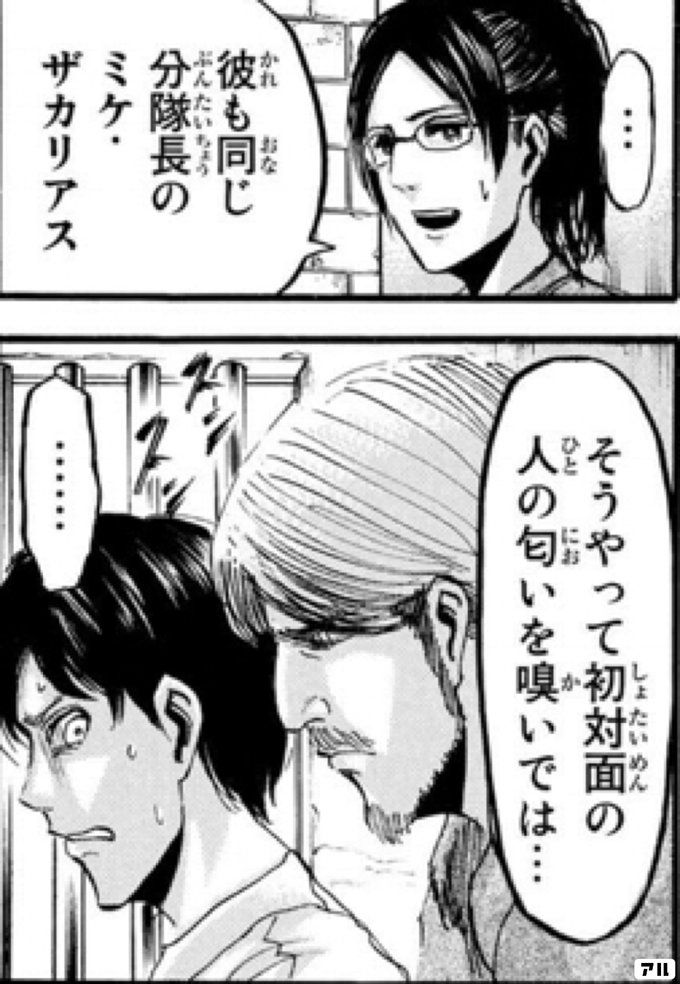 彼も同じ分隊長の ミケ ザカリアス そうやって初対面の 人の匂いを嗅いでは 進撃の巨人 アル